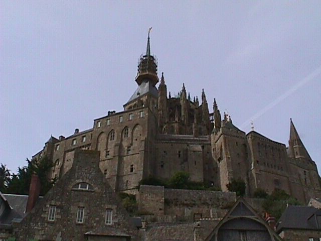 it?). Mont-Saint-Michel is basically a small, steep hill. The abbey at the top was built in the 12th century or so, and a small village grew up around it. The abbey served in later years as a fortress (which explains the rampart going all the way around the island) and a prison. Today it's back to being an abbey; monks have been living there since 1969, but it's hard to see how they get any peace and quiet, because the village is a bona fide tourist trap. There's one street, narrow even by French standards, and it's loaded with hotels, restaurants, wax museums, and souvenir shops. We stayed in a three-star hotel, which sounds nice until I tell you we were on the top floor and most French hotels don't have elevators. The abbey, however, is well worth visiting. It's Romanesque although parts of it got a Gothic makeover, but still it's much less flamboyant and gaudy than Notre Dame or Chartres. It was nice to see something a bit more spare and reserved for a change. At night a hundred carefully placed floodlights go on, and the abbey glows like a Christmas pudding. Inside there's currently a multimedia installation called "Les songes a nuit" (Dreams of the Night), where film, sculpture, tapestry, and recorded music and voices greet visitors. Some of the recorded voices were incredibly cheesy, even in French—like a bad haunted house. And some of the artwork didn't seem to belong in an abbey, but other bits of it were quite nice. We took a lot of pictures. See what you think. |
