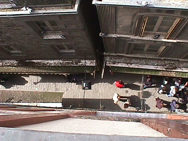 | Mont-St.-Michel's only street as viewed from our hotel room window. | The flag of Brittany atop a rampart wall. Two lions are better than one. | ||