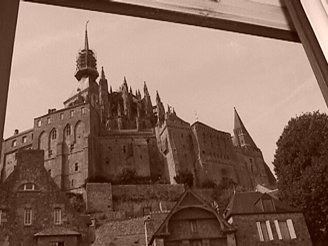 | The view of Mont-St.-Michel's abbey from our hotel room window. There's apparently some maintenance work being done on the abbey steeple. That's what we get for coming after tourist season. | Same view, in sepia, just for fun. People seem to like this view, and several have asked me which hotel we stayed in. It was Hotel Croix Blanche—a great place to stay if you don't mind stairs. | ||