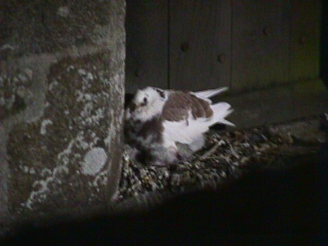 | The view back down the street, toward the cathedral. As small as this island is, there are at least two churches on it. Someone had just gotten married at the cathedral when we passed by. | The abbey at night. | The bits of fluff beneath the pigeon appear to be her young. I had never seen baby pigeons before. | We walked back up to the abbey and went inside to visit the "Dreams of the night" exhibit. Giant mutant hamsters were formerly kept at Mont-St.-Michel; here is the exercise wheel to prove it. |