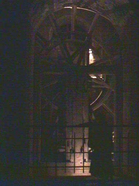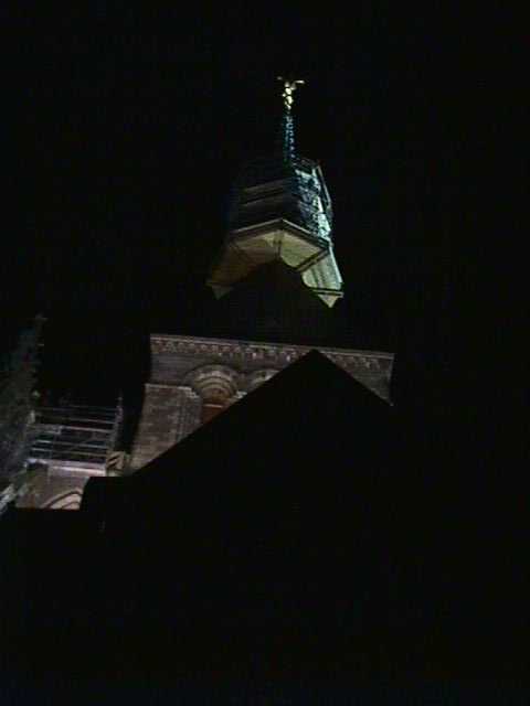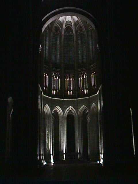 | Mont-St.-Michel is, of course, named for the archangel Michael, who appeared to a French bishop (I forget the bishop's name) in a dream and told him to build it. It seems the bishop was a little slow in carrying out Michael's orders, so the angel returned to him two more times, and got his point across by poking a hole in the bishop's skull. | See what I mean? Of course, when your head's been sliced in two, why should you worry about a little hole in the skull? | The abbey steeple at night. The statue at the top is Michael, again, in gold. | Interior of the abbey chapel. The stained-glass windows are simpler than the Gothic variety; they bear geometric knot patterns reflecting Brittany's Celtic heritage. |
