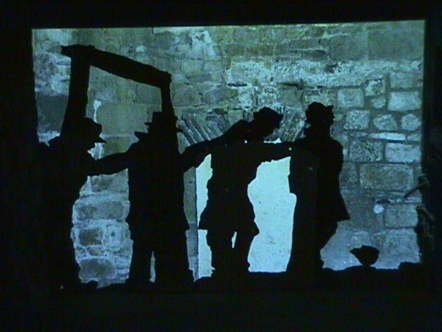 | Mont-St.-Michel is also the original location of Plato's cave. This is from an animated film, done using very complicated shadow puppets, that depicts all sorts of pilgrims (the abbey was a popular pilgrimage site). The film was being projected on an abbey wall as part of the installation. | Another scene from the pilgrim film. There's no dialogue, only the tune to "What a Friend We Have in Jesus." | Here's a puzzler: A banal chat-room session, moving in real time, is projected over an 8-foot plastic shark with its head stuck in a pillar. Speech software reads the chat session out loud. Technology makes me feel this way too, but what is this doing in an abbey? | Romanesque columns in the main chapel of the abbey. The video screen is part of the art installation. |